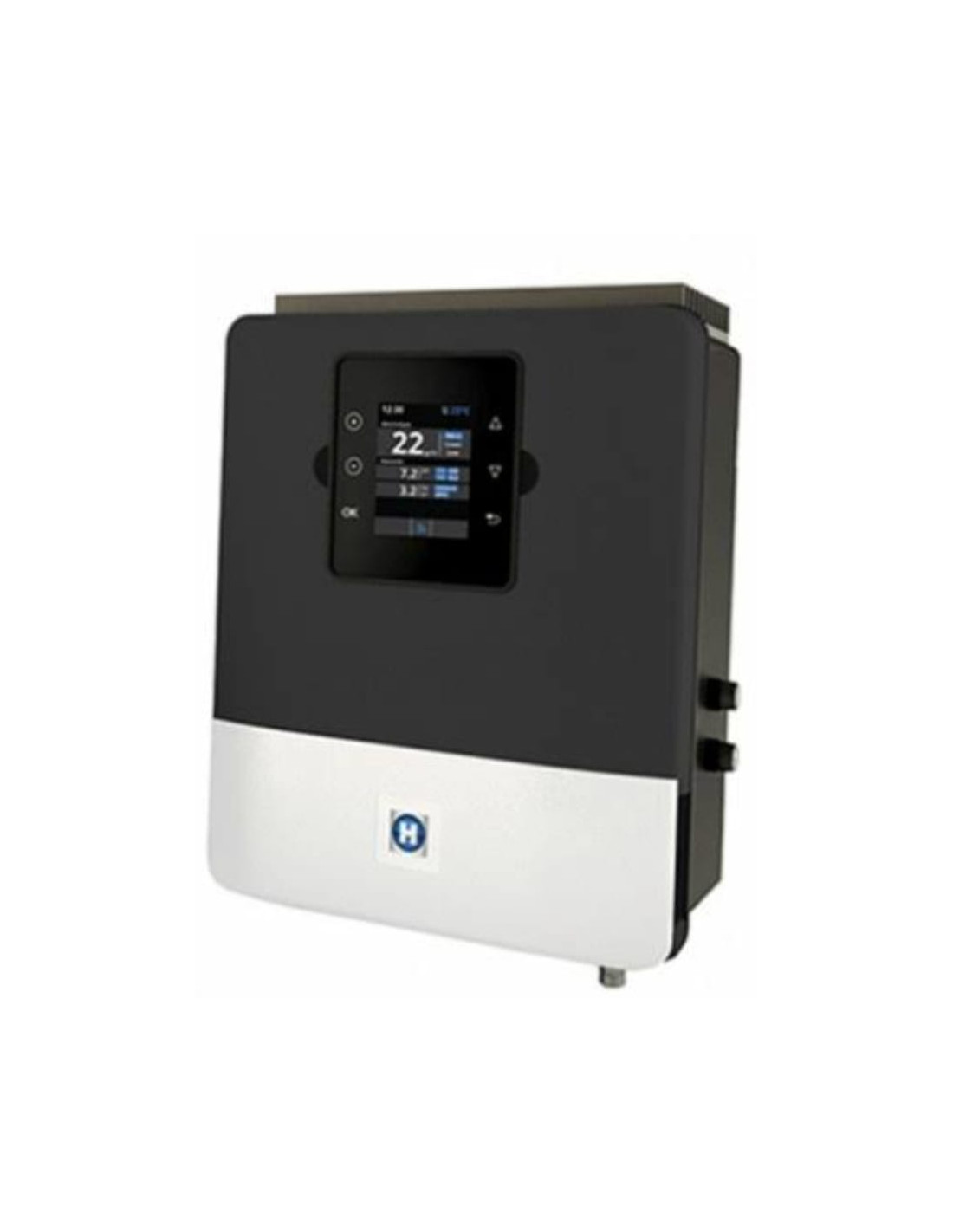 Clorador salino avanzado diseñado para garantizar una desinfección eficiente, estable y completamente automatizada en piscinas de hasta 115 m³. Medidas: 27 x 22 x 12 cm