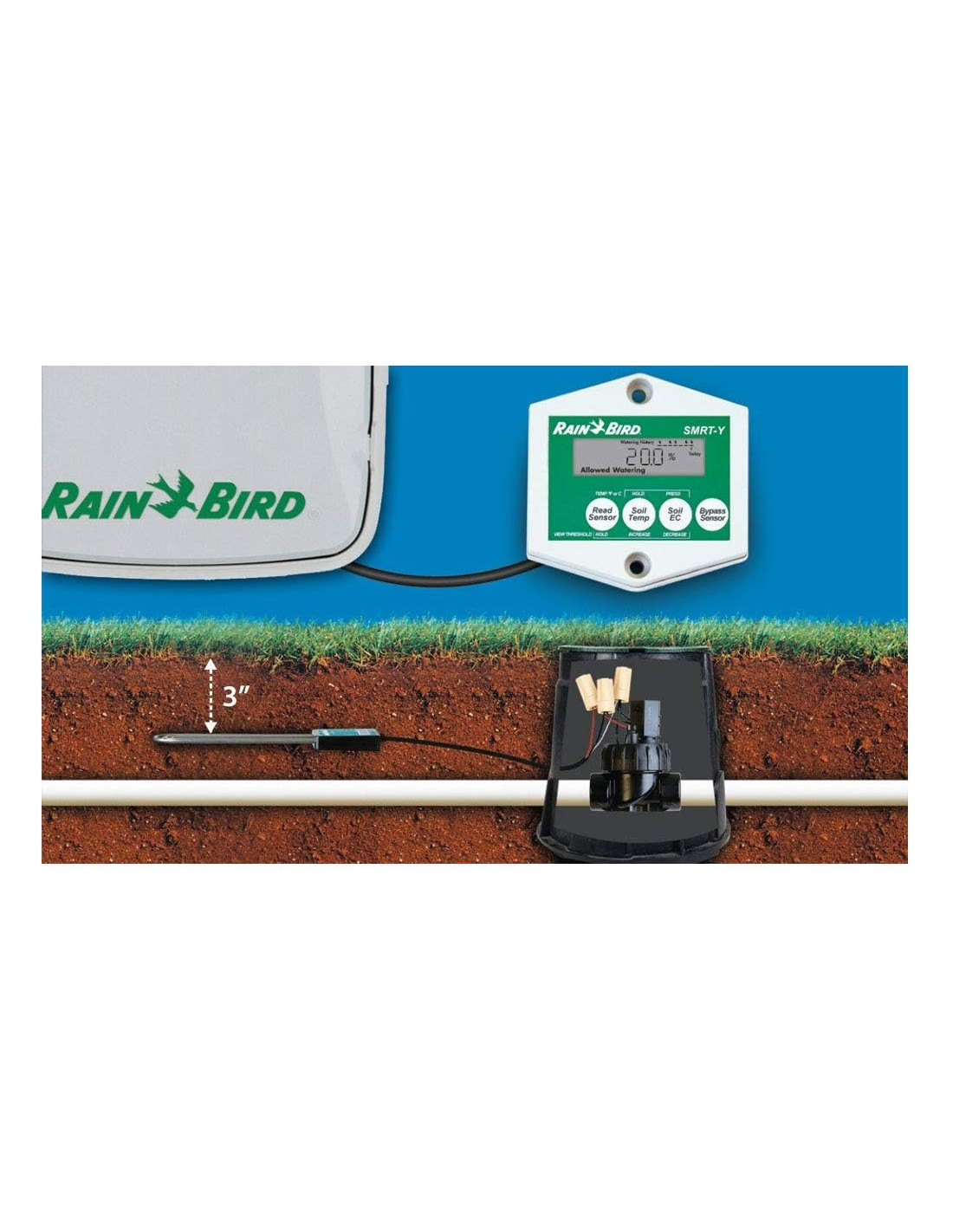 El Rain Bird SMRT-Y es un kit de sensor de humedad del suelo diseñado para optimizar el consumo de agua en sistemas de riego automático. Este sensor inteligente mide de forma precisa el nivel de humedad del terreno (0%–100%), ajustando automáticamente los tiempos de riego según las necesidades reales de las plantas.