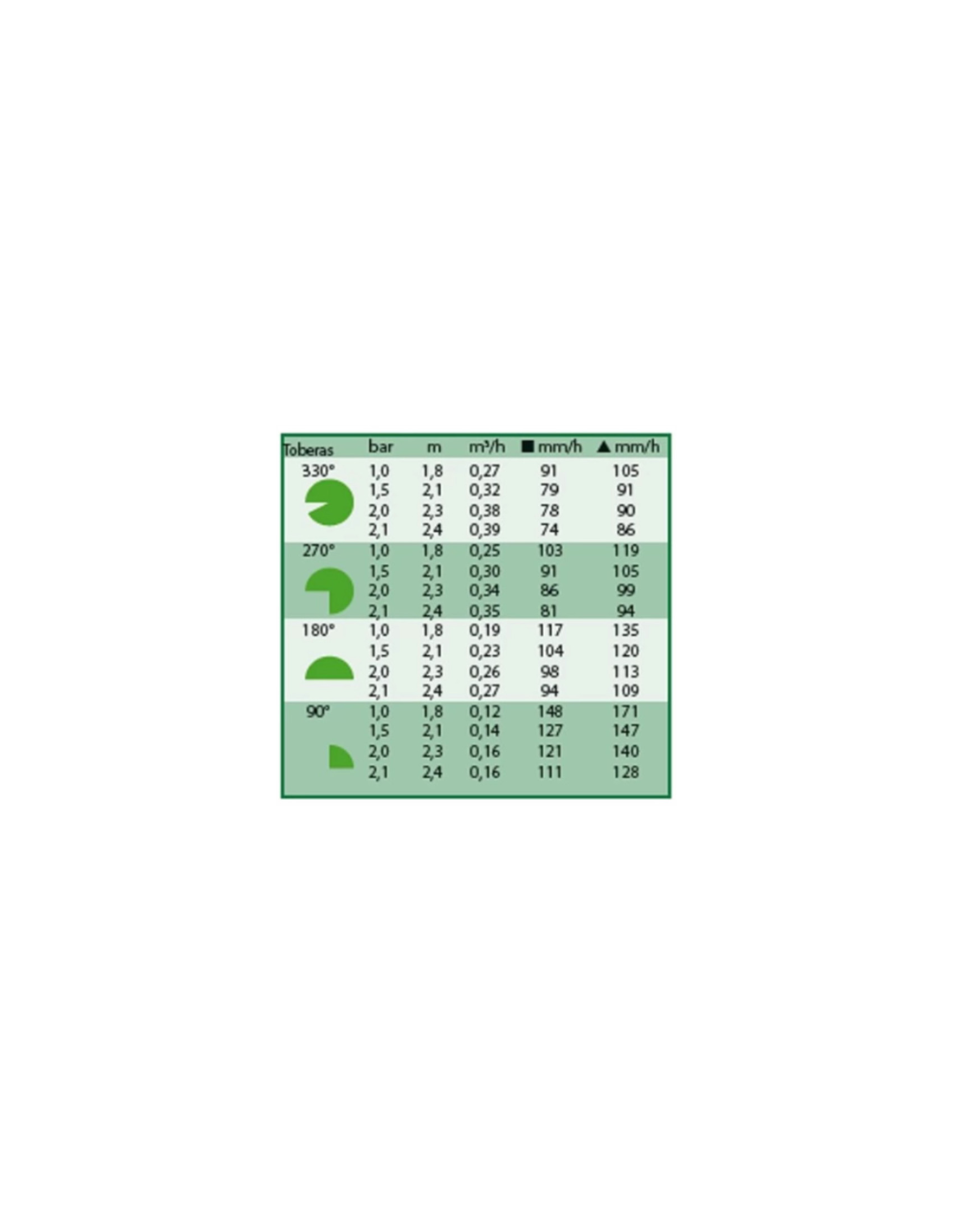 - de 0,12 a 0,39 m³h dependiendo del ajuste del sector
