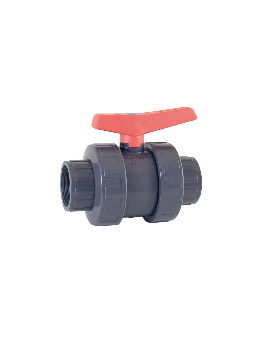 Válvula de bola, cuerpo completo de PVC, salidas rosca hembra de 1 ½" diseñada para abrir o cerrar manualmente el flujo de agua en el sistema.