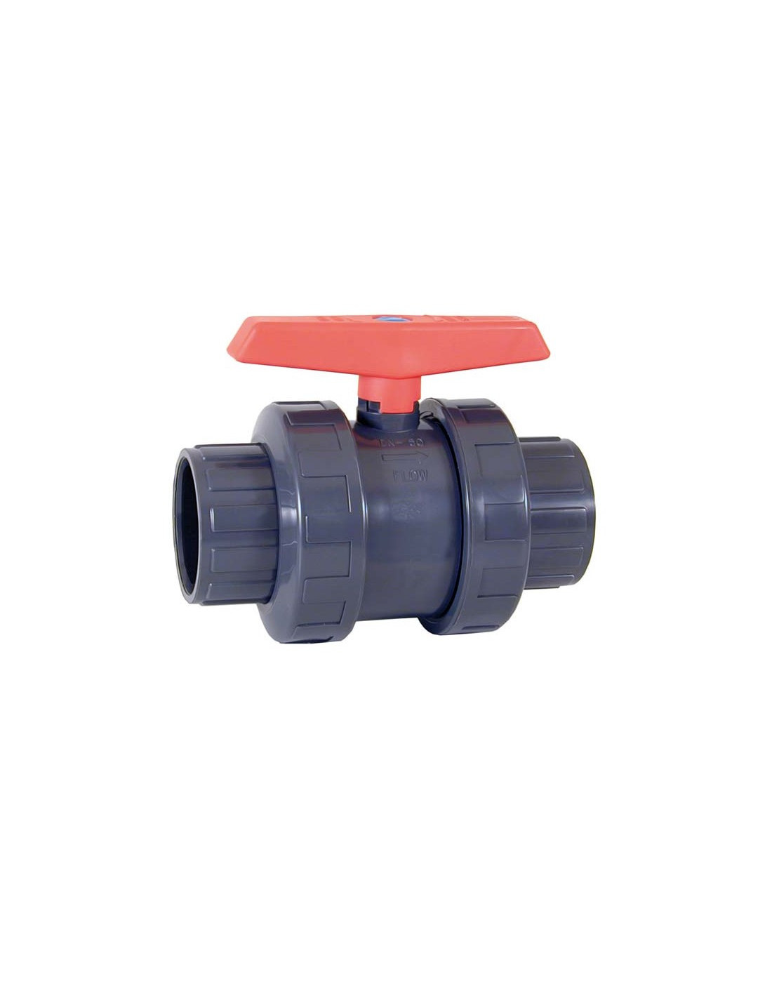Válvula de bola, cuerpo completo de PVC, salidas de 50 mm a encolar, diseñada para abrir o cerrar manualmente el flujo de agua en el sistema.