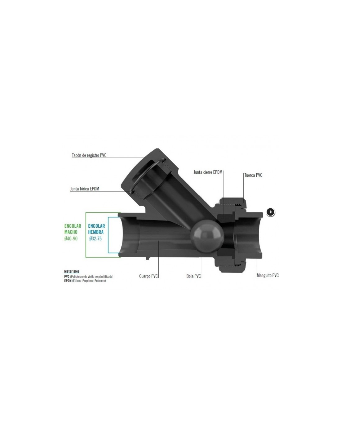 VALVULA DE RETENCION BOLA PVC Y GRIEGA 63mm